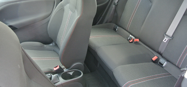 The upper moulding of the dashboard is ‘soft-touch’, which adds to the overall quality feel of the car. However, the signature splashes of a racy red on dashboard and seat stitching, combine with the piano-black and alloy trim sections to create a nicely assembled cabin environment. The door pockets are deep and accommodating and, while the can-holders ahead of the gearlever will almost (but not quite) allow a McDonalds milk-shake to be carried, the extra oddment space is appreciated. The driving position is multi-adjustable and provides significant space for occupants of larger stature.